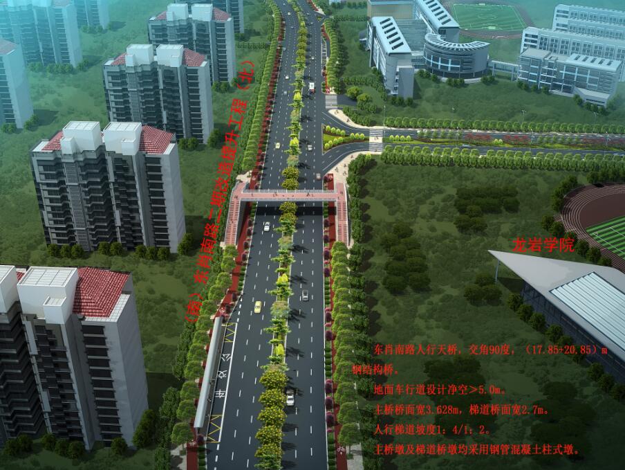 龍巖學(xué)院人行天橋位于龍巖學(xué)院大門北側(cè)約50米處,天橋采用“工”字形設(shè)計(jì),橋面長(zhǎng)40米、寬3.6米,兩側(cè)梯道坡度為1:4和1:2,跨度分別為17.85米和20.85米,寬2.7米,主橋墩及梯道橋墩均采用鋼管混凝土柱式墩,總投資約450萬(wàn)元。