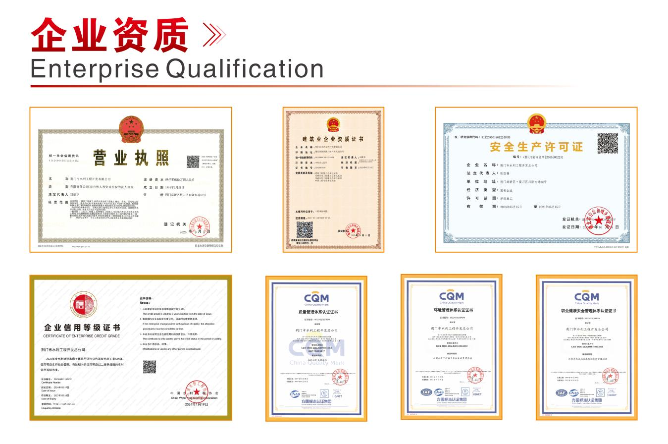 企業(yè)資質(zhì)與榮譽是企業(yè)綜合實力的“通行證”。水利公司具有水利水電、建筑工程、市政公用工程三項施工總承包貳級資質(zhì)和環(huán)保工程專業(yè)承包貳級資質(zhì),2024年12月成功通過高新技術(shù)企業(yè)認(rèn)定。主要從事水利水電工程、建筑工程、市政公用工程、環(huán)保工程、工程質(zhì)量檢驗檢測服務(wù)等,綜合實力躋身省內(nèi)水利施工行業(yè)第一方陣。