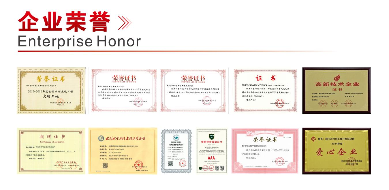 承建的湖北省漳河灌區(qū)續(xù)建配套與節(jié)水改造工程被國家水利部、省水利廳授予“文明工地”稱號;承建的湖北省漳河灌區(qū)三干渠續(xù)建配套與節(jié)水改造工程、漢北河防洪治理工程、漢西水系連通工程、東寶區(qū)水系連通工程等項目獲得“湖北省水利工程優(yōu)質(zhì)獎(江漢杯)”榮譽稱號。